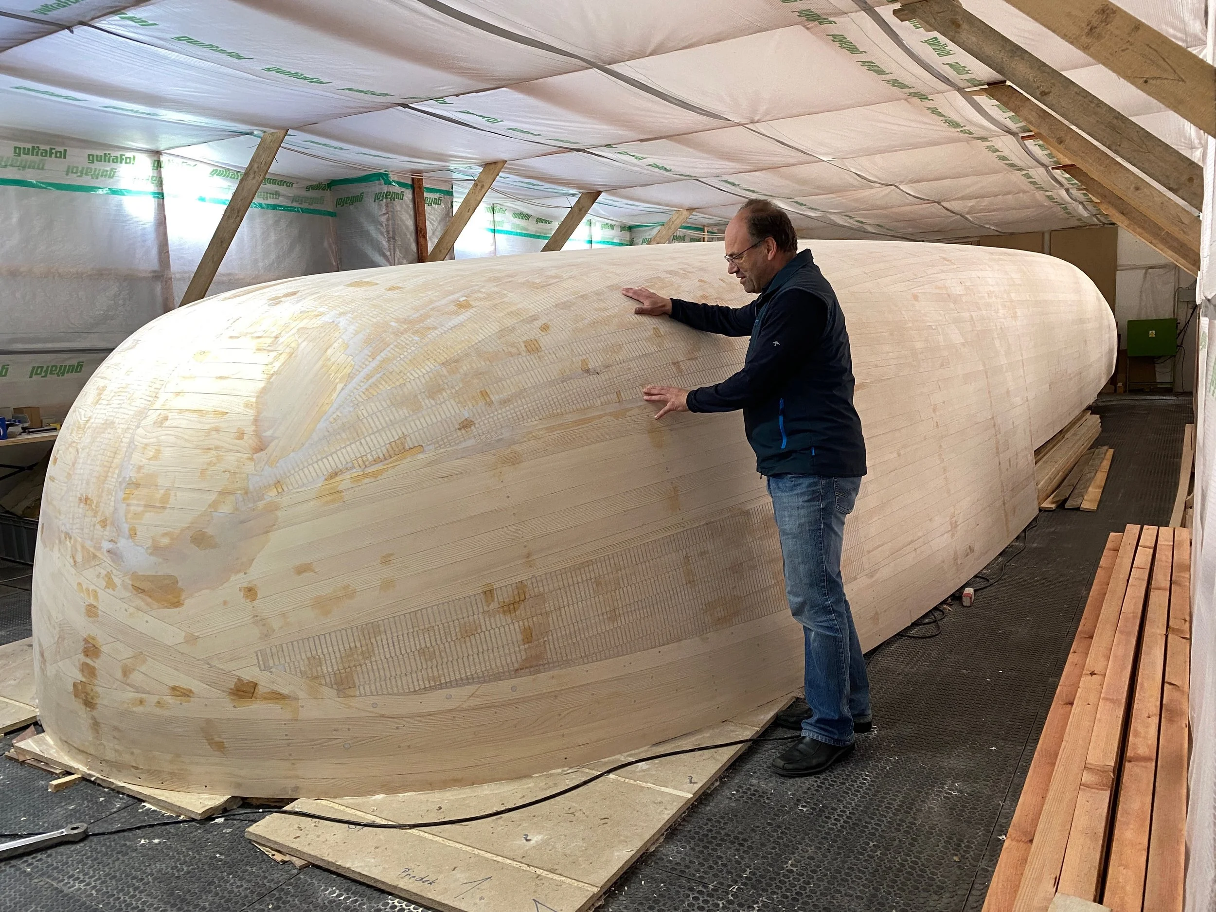 Der Rumpf aus massiver Weißtanne gewährleistet Elastizität und Festigkeit, während eine widerstandsfähige GfK-Beschichtung das Holz schützt. Durch die Holzkonstruktion liegt der Kunststoffanteil bei weniger als einem Viertel eines vergleichbaren GfK-Bootes – ein deutlicher Fortschritt in ökologischer Materialverantwortung.